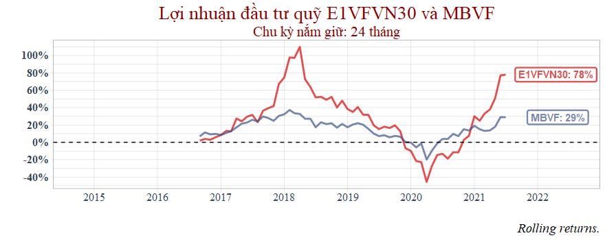 Với chu kỳ nắm giữ 12 tháng, ta thấy rằng có thời điểm quỹ MBVF mang lại lợi nhuận nhiều hơn E1VFVN30, như giai đoạn 2019 và cuối năm 2020. Tuy nhiên phần lớn quãng thời gian thì E1VFVN30 hoạt động hiệu quả hơn MBVF. Tôi sẽ thống kê số lần mà E1VFVN30 mang lại tỷ suất sinh lợi nhiều hơn MBVF ở cuối bài.
