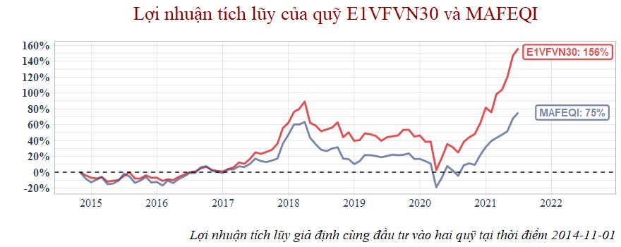 Đầu tiên là sẽ giả định cùng đầu tư ETF (mà ở đây là E1VFVN30) với quỹ mở cổ phiếu xem cái nào vượt trội.