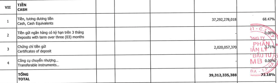 Tiền chiếm 72% quỹ. Giống như giai đoạn 2018 trước đây, quỹ cũng toàn là tiền khi thị trường uptrend mạnh. Vì điều đó mà quỹ thua ETF E1VFVN30.