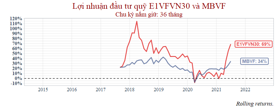 Nếu cùng đầu tư một thời điểm từ tháng 10/2014 đến nay thì MBVF thua hoàn toàn so với ETF E1VFVN30.