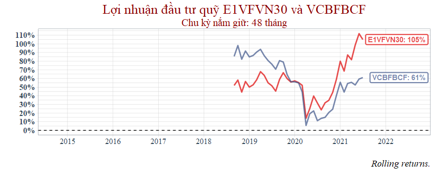 Điểm giao nhau giữa 2 quỹ rơi vào năm 2020. Từ giai đoạn 2017 trở về trước thì quỹ VCBF-BCF chiến thắng ETF. Nhưng sau đó thì VCBF-BCF bị tụt lại phía sau khiến lợi nhuận tích lũy của chu kỳ nắm giữ 4 năm thua hoàn toàn so với ETF.