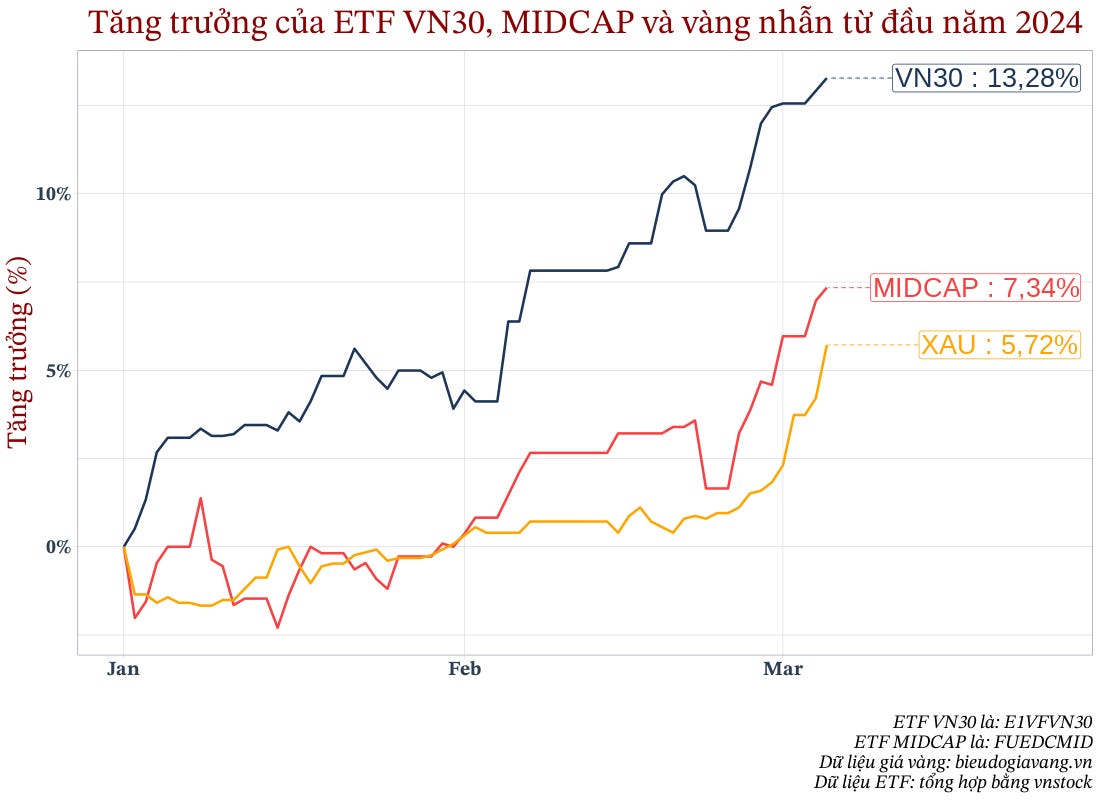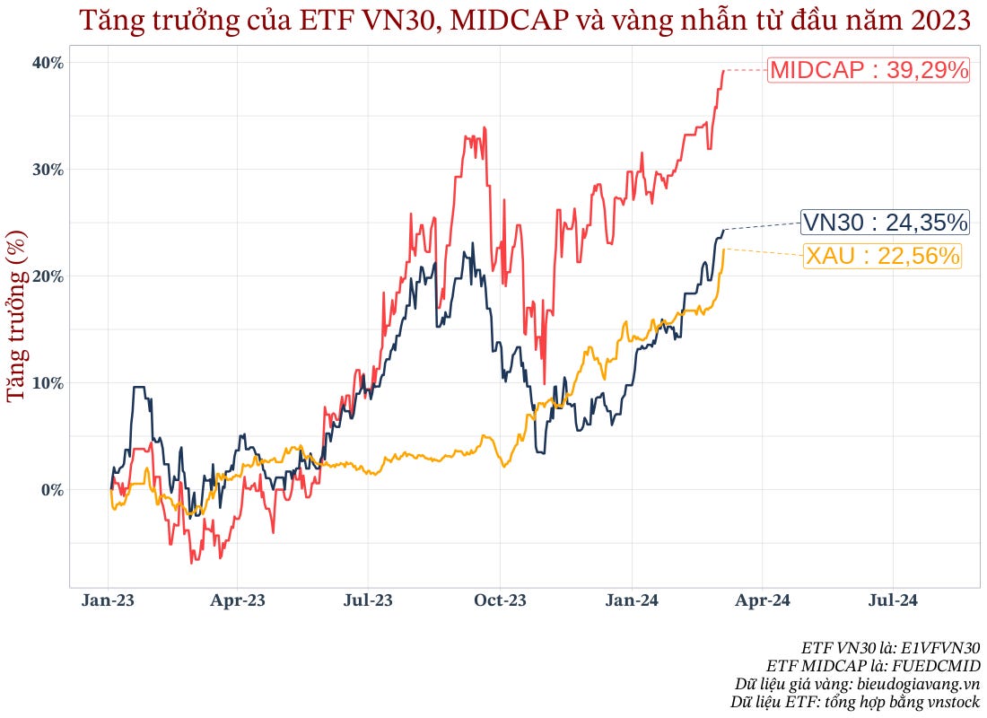 Chúng ta dễ dàng nhận ra rằng tăng trưởng của vàng nhẫn không bằng hai loại ETF VN30 và MIDCAP.