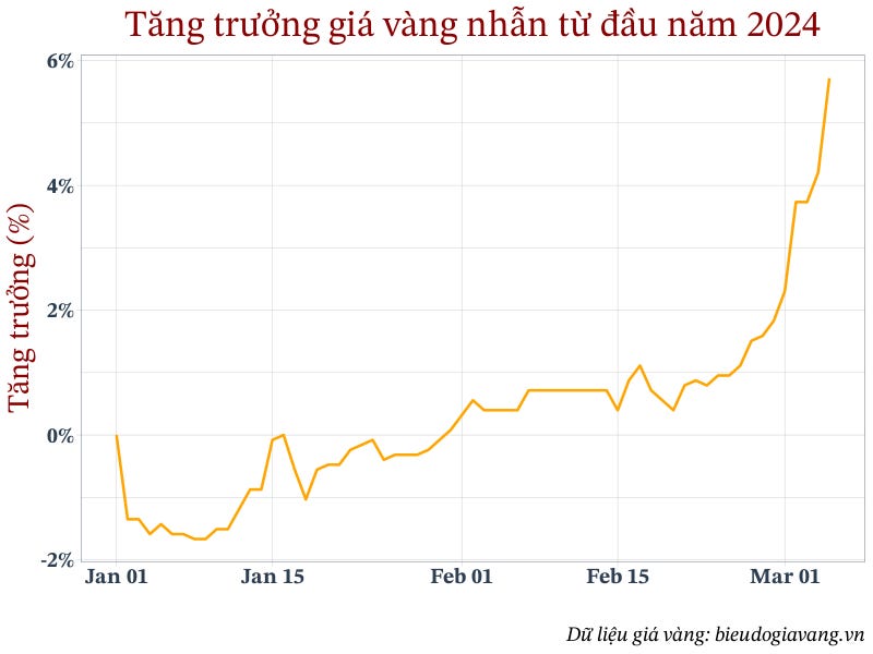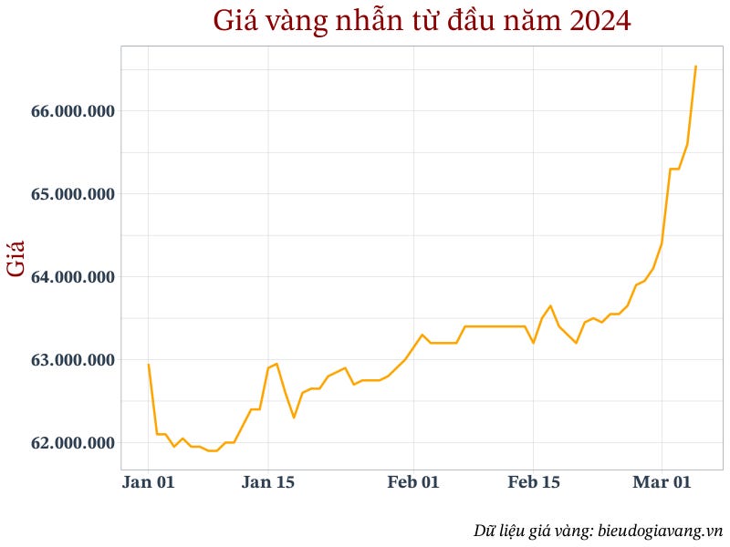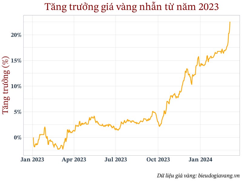 Từ tháng 01/2023 đến 05/03/2024, tương đương 14 tháng, giá vàng nhẫn đã tăng trưởng rất tốt hơn 22%. Tốt hơn gửi tiền tiết kiệm ngân hàng.