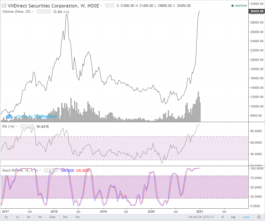 Cả thị trường sôi động như cuối năm 2017, đầu năm 2018. Giá cổ phiếu nhiều doanh nghiệp hiện tạo đã tạo mô hình parabolic y như hệt năm 2018. Dòng tiền vào cực nhiều khiến giá cổ phiếu tăng cao.