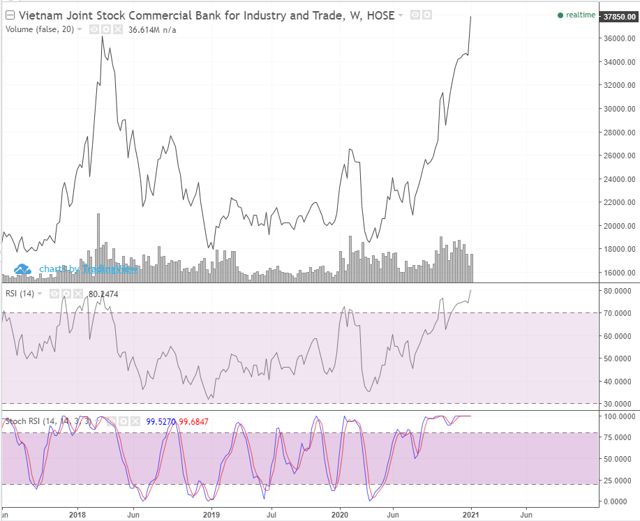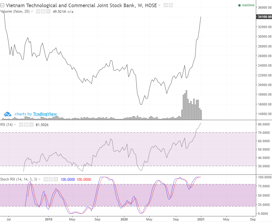 Biểu đồ tuần của CTG, TCB và các ngân hàng khác đều tăng giá kinh khủng.
