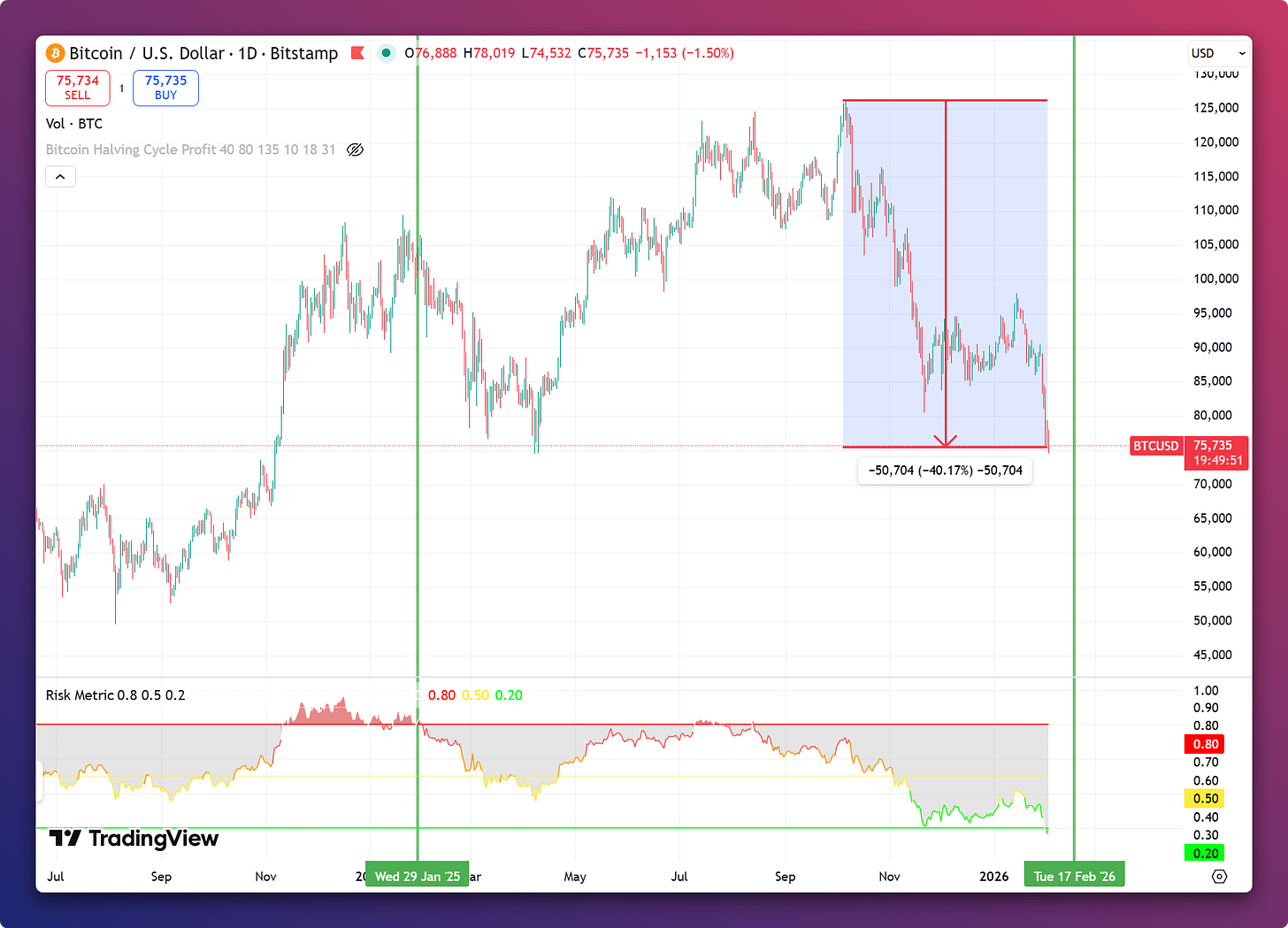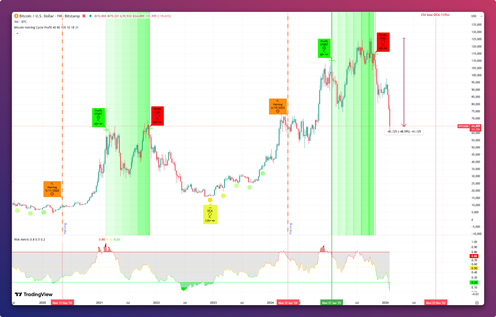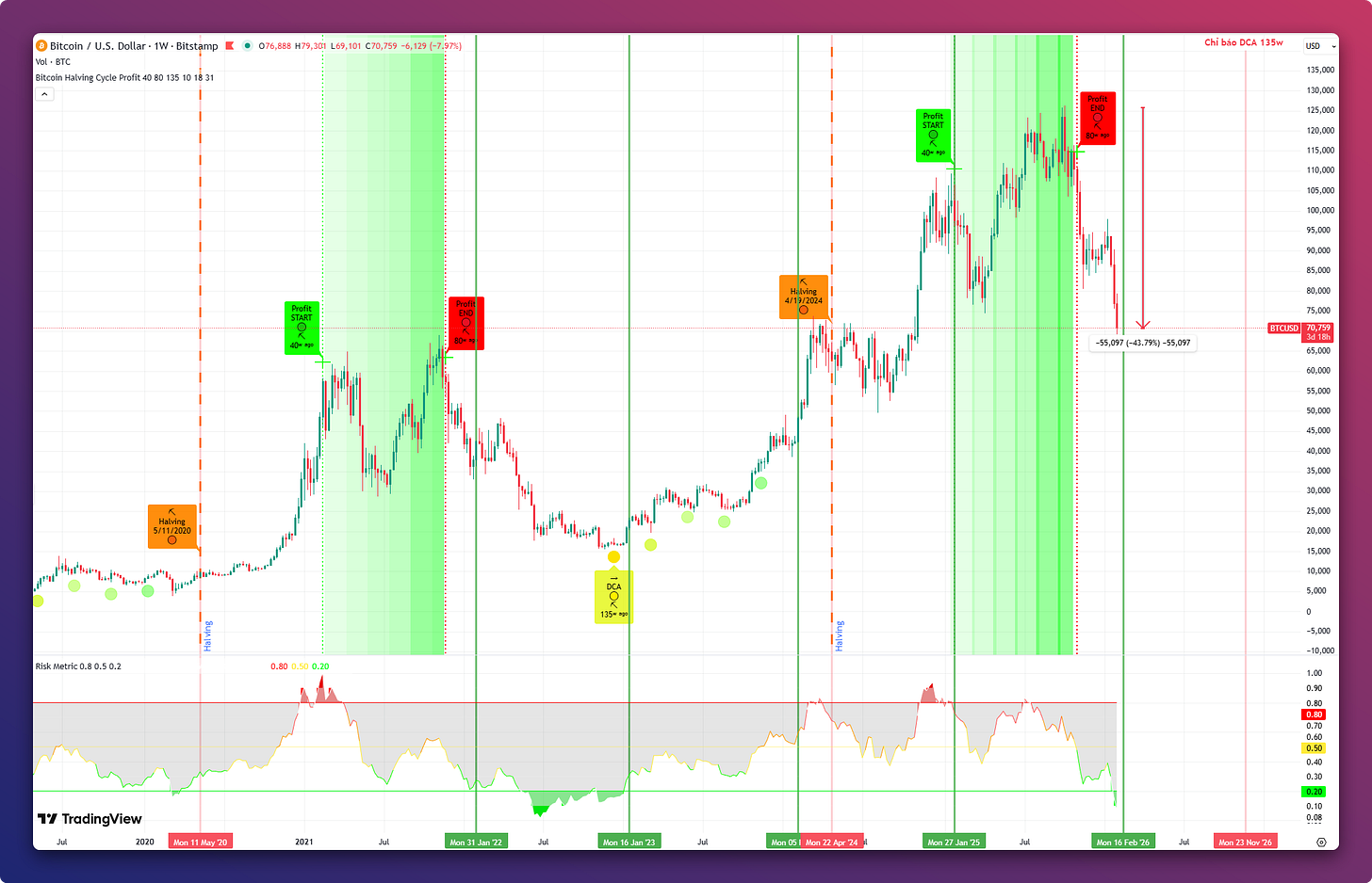 Bitcoin dip mạnh hơn thì tuần sau chỉ báo Risk Metric sẽ có màu xanh lá cây đậm.