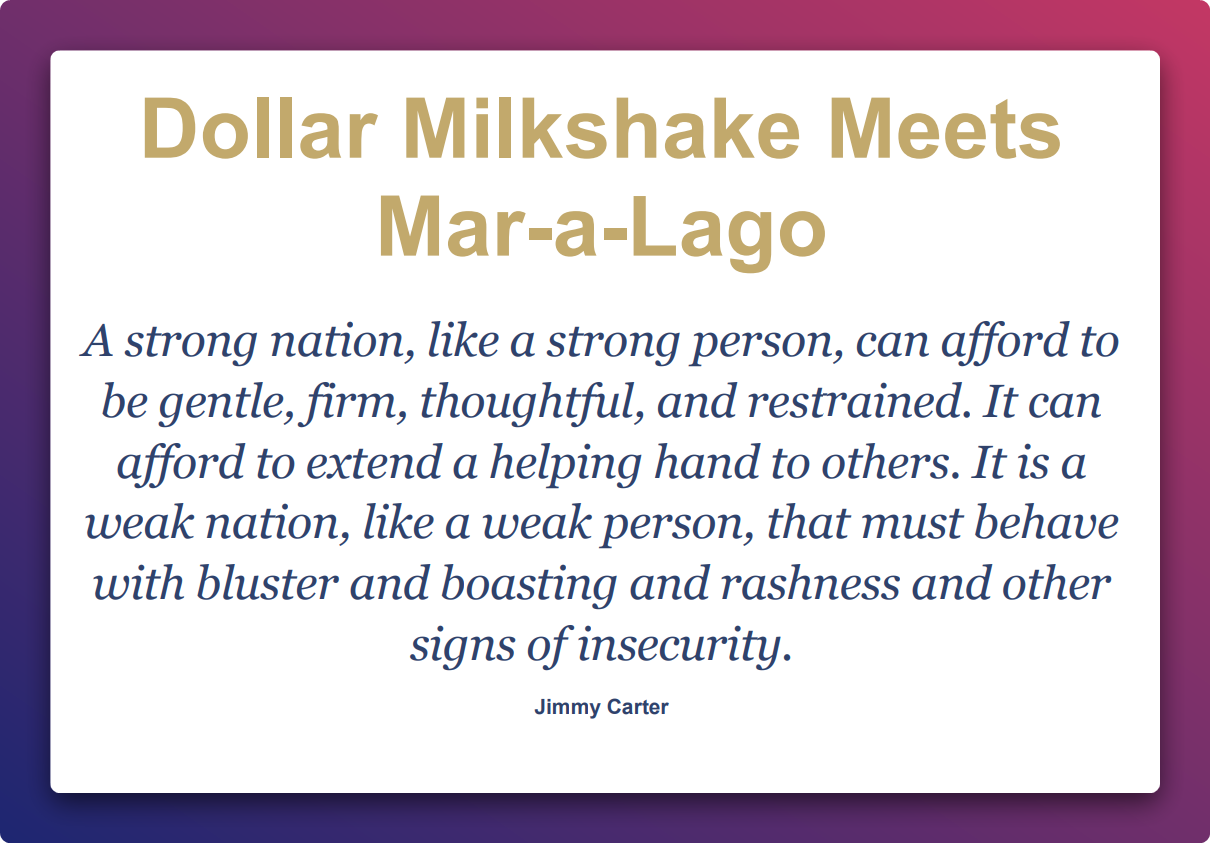 Dollar Milkshake ám chỉ rằng dù thế giới có bất ổn đến thế nào đi chăng nữa, Mỹ cũng sẽ làm mọi cách để mà khơi dậy sức mạnh của đồng USD. Nước Mỹ sẽ khiến cả thế giới cần đồng USD trở lại bằng cách lợi dụng vị thế độc tôn của USD, áp đặt thuế quan và sử dụng tầm ảnh hưởng kinh tế để buộc các nước khác phải tuân thủ theo họ.