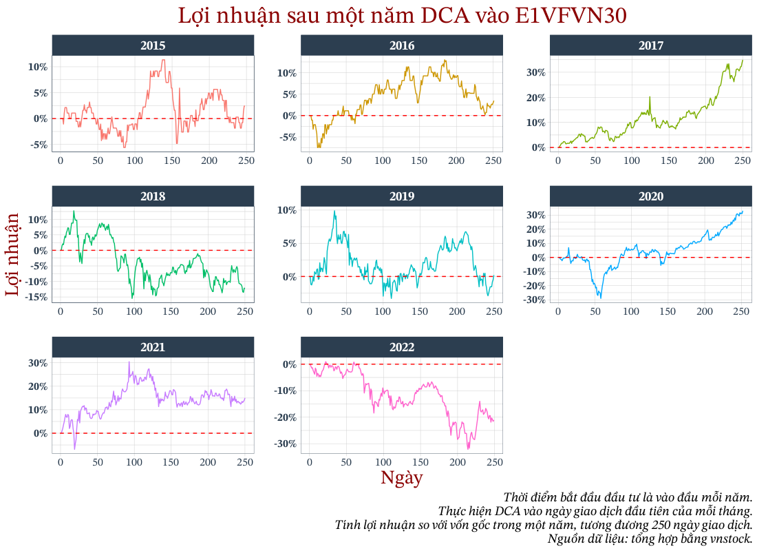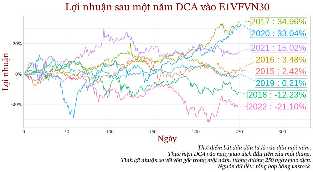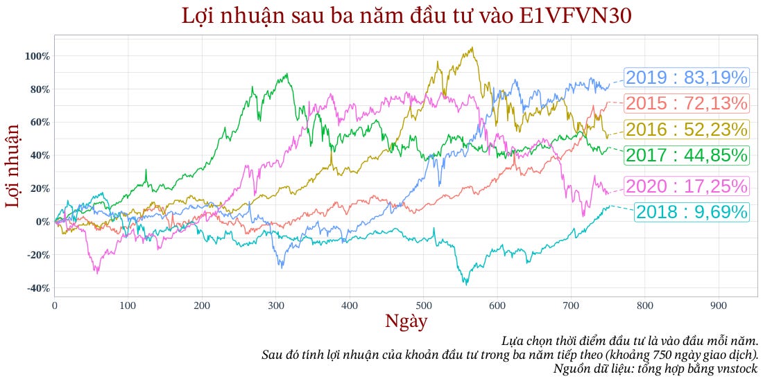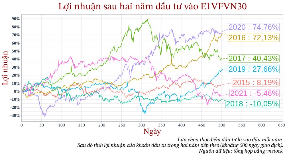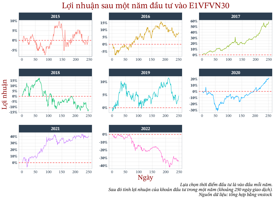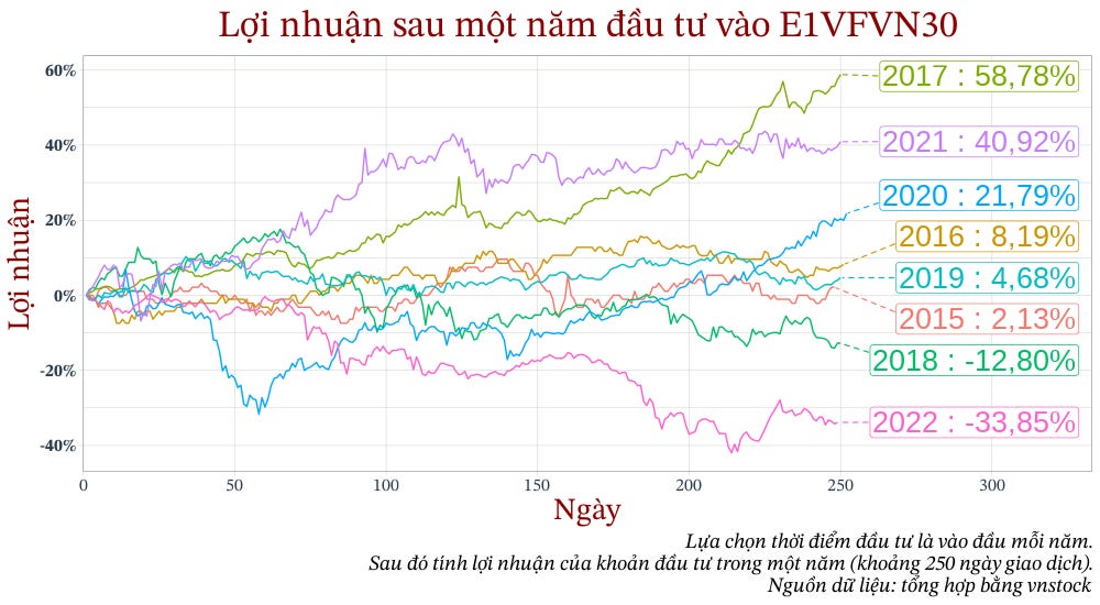 Tỷ suất sinh lợi bình quân hằng năm của E1VFVN30 (từ ngày giao dịch đầu tiên cho tới thời điểm hiện tại lúc tôi viết bài này, tháng 05/2023) là khoảng hơn 10%/năm. Tuy nhiên, điều đó không có nghĩa rằng bây giờ bạn mua E1VFVN30 thì năm sau bạn sẽ có lợi nhuận 10%.