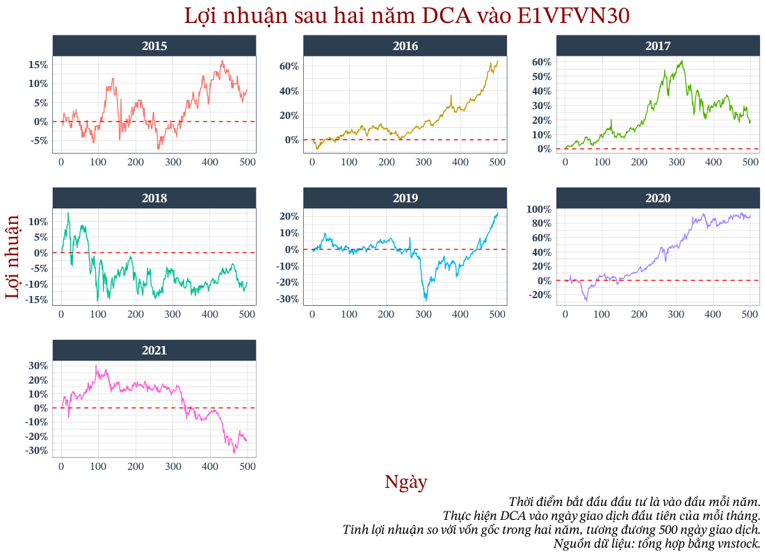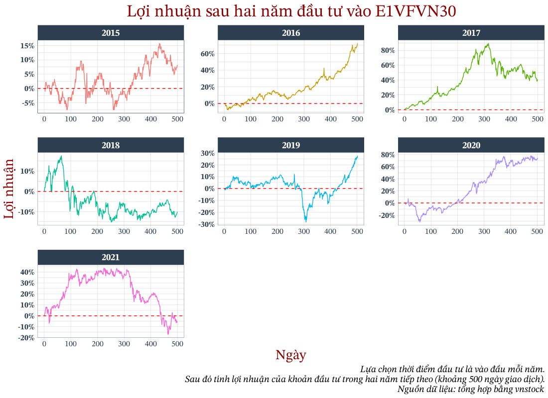 Tôi sử dụng dữ liệu của ETF E1VFVN30 (với lý do là có nhiều dữ liệu - từ năm 2015 đến năm 2022) để phân tích về kết quả mà nhà đầu tư sẽ nhận được trong 1, 2 và 3 năm sau khi đầu tư vào E1VFVN30.