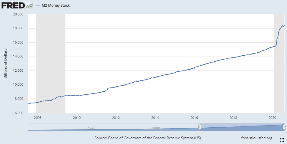 Hiện tại các ngân hàng trung ương không còn gì ngoài những gói QE để kích thích nền kinh tế, nếu trong ngắn hạn FED thực hiện tiếp một đợt nữa thì khả năng giá vàng sẽ tiếp tục tăng. Chưa kể một điều đó là nền kinh tế Mỹ hiện tại đã ngập trong nợ, các doanh nghiệp liên tục vay nợ để hoạt động, trường hợp nhận biết rõ nhất đó chính là Hertz. Dự báo rằng nợ của Mỹ sẽ xấp xỉ 100% GPD vào năm 2030 nhưng ngay thời điểm tháng 6/2020 này thì số nợ đã tăng lên 20,53 ngàn tỷ đô, khoảng 106% GDP. Nó giống như một con bệnh, cho uống thuốc nhằm kéo dài thời gian hy vọng chữa được bệnh. Nếu ta có thuốc đúng thì tiếp tục duy trì cuộc sống, còn uống thuốc sau thì đổ bể. Lượng tiền trên toàn nền thế giới sẽ liên tục tăng, và điều đó đồng nghĩa rằng vàng sẽ có giá trị hơn nữa.