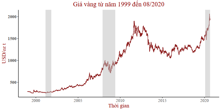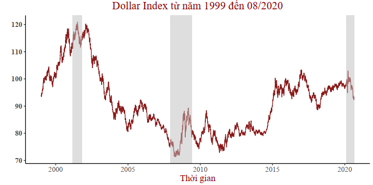 Dưới đây là 2 biểu đồ giá vàng và Dollar Index. Vùng màu xám là các quãng thời gian khủng hoảng, số liệu lấy từ FRED.