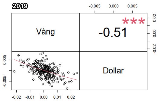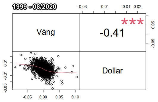 Hệ số tương quan giữa Vàng và Dollar là -0,41. Có nghĩa là có mối tương quan ngược chiều với nhau nhưng ở mức trung bình.