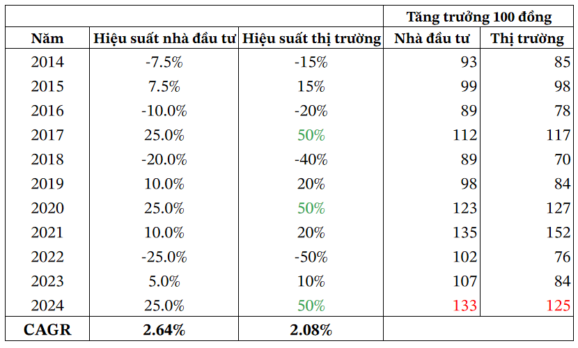 Tôi lấy ví dụ nhà đầu tư có hiệu suất danh mục lúc chiến thắng thấp hơn 50% so với thị trường, và khi thua lỗ thì cũng thua lỗ ít hơn 50%. Kết quả như trong bảng sau: