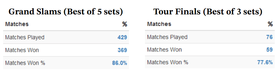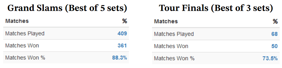 Mặc dù lợi thế của Roger Federer không đổi, là 4% so với đối thủ, nhưng việc chuyển từ đánh 3 set lên thành 5 set đã làm cho tỷ lệ thắng của anh tăng 10%.