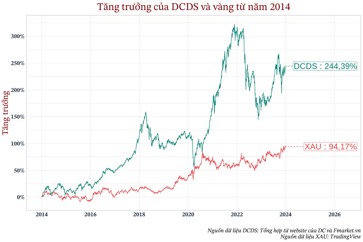 1 - Tôi so sánh DCDS với giá vàng từ năm 2014 đến hết năm 2023 (10 năm)