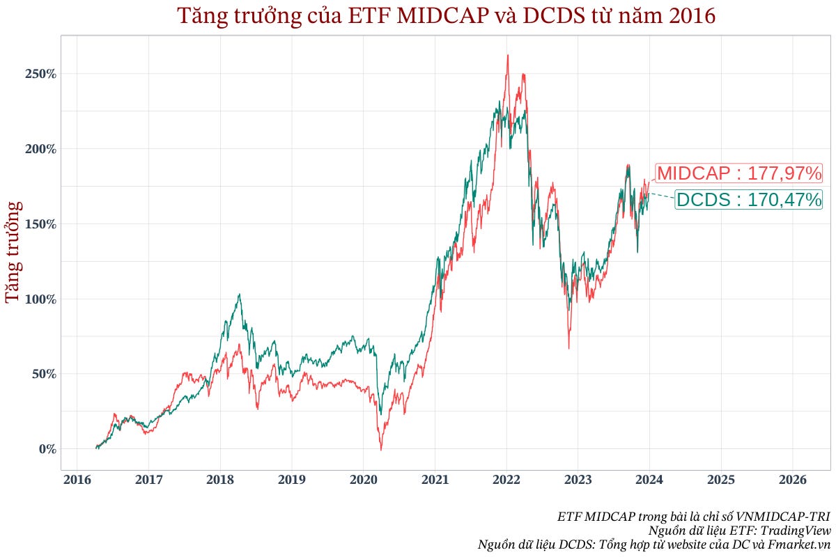 Bằng một cách nào đó mà tăng trưởng của ETF MIDCAP lẫn DCDS lại tương đương nhau. Liệu các nhà đầu tư có nên chuyển sang đầu tư ETF MIDCAP hết không? Hẹn lần sau tôi sẽ phân tích kỹ hơn về chủ đề này.