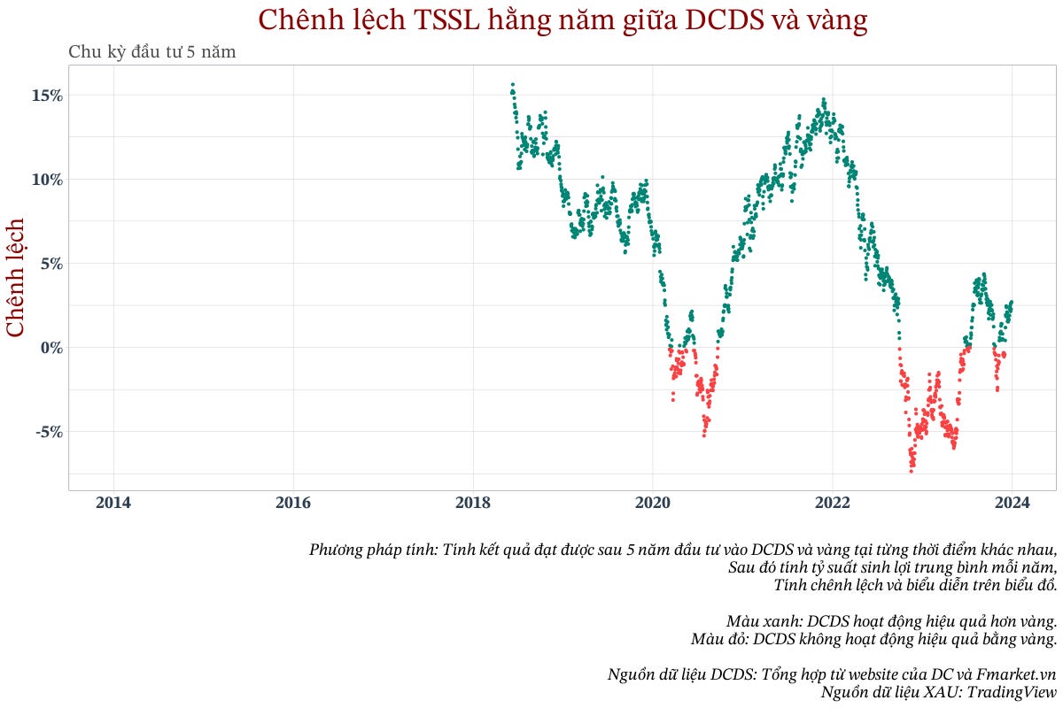 Nếu chúng ta so sánh chênh lệch tỷ suất sinh lợi (TSSL) hằng năm giữa DCDS và vàng với chu kỳ đầu tư 5 năm (trung hạn) thì sẽ có kết quả: