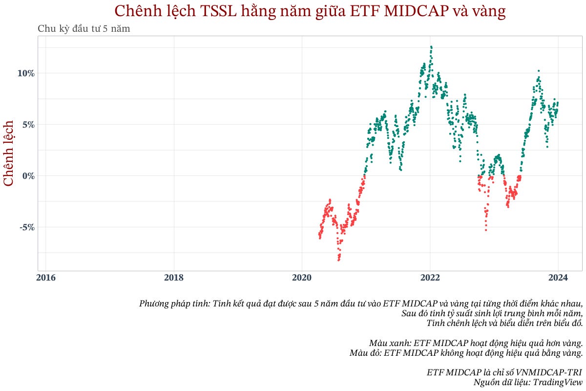 Nếu so sánh chênh lệch TSSL giữa ETF VN30 và vàng với chu kỳ đầu tư 5 năm thì có kết quả: