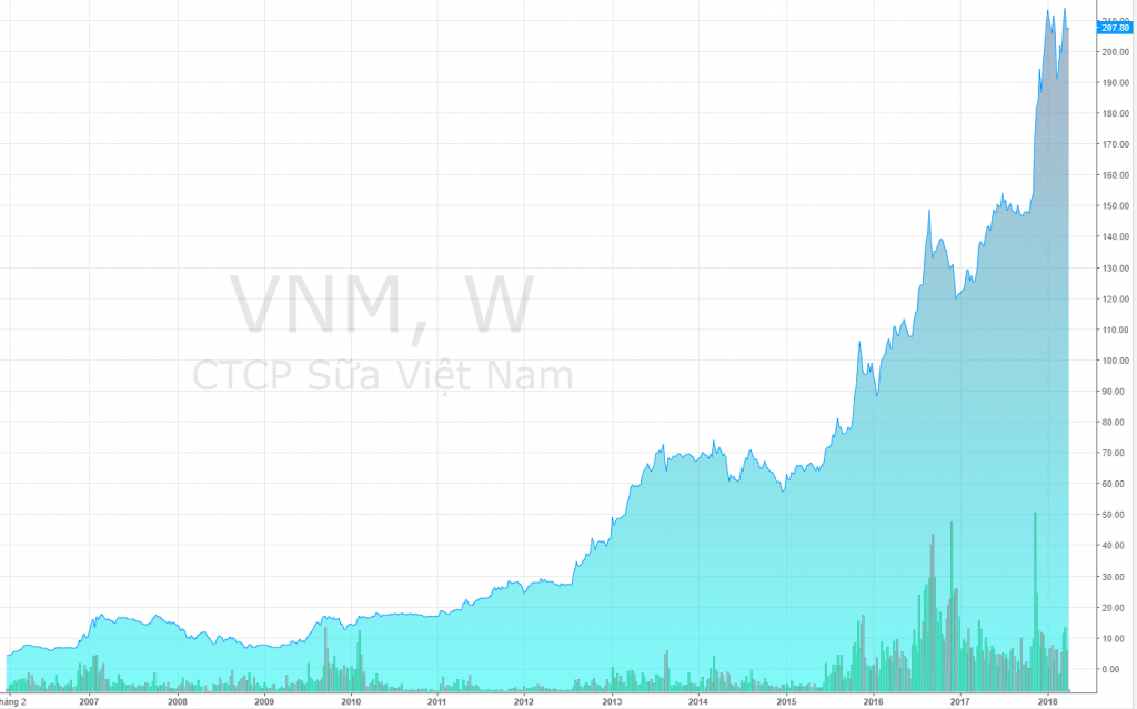 5. Bạn có thể tự mình làm điều đó mà không cần ai đó phải đứng ra làm hộ bạn. Tôi lấy ví dụ bạn mua cổ phiếu Vinamilk (vì nhà bạn ai cũng uống Vinamilk) từ đầu năm 2017 với giá 121.000 tới nay, và bạn chỉ mua mỗi Vinamilk cho danh mục của mình thôi. Thì tính tới thời điểm này 26/03/2018 bạn đã lời ~70% rồi chưa tính cổ tức.