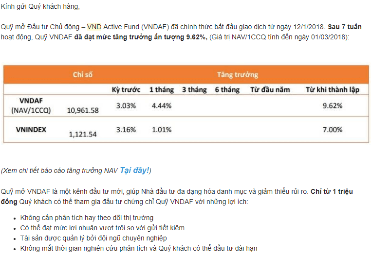 Quảng cáo quỹ đầu tư VND Trên đó là một cái quảng cáo của công ty VND, ngoài ra cũng có một bên Timo quảng cáo của VinaCapital nữa nhưng tôi không tìm lại được cái email. Và họ tiếp tục giới thiệu: