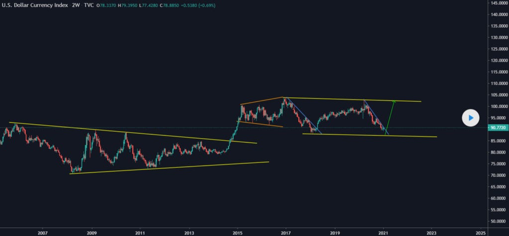 Vì tôi có quan tâm đến giá vàng, nên hay đi dạo mạng và có bắt gặp các phân tích vẽ đường xu hướng của chỉ số DXY (Dollar Index - sức mạnh đồng đô la Mỹ), ví dụ như: