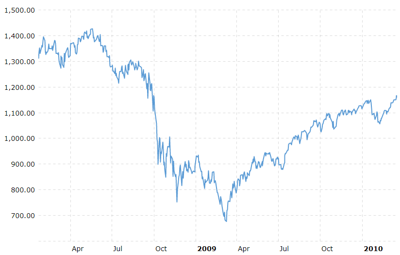 Vào thời điểm tháng 03/2009 thị trường chứng khoán đã tạo đáy và sau đó cả chứng khoán lẫn vàng bắt đầu xu hướng tăng mới. Tâm lý của nhà đầu tư đã ổn định, họ không còn nhu cầu trữ USD nữa. Kết hợp với việc FED "bơm" tiền hỗ trợ, gây lo sợ về các khoản nợ, đã làm đồng USD suy yếu so với các ngoại tệ. (EUR)