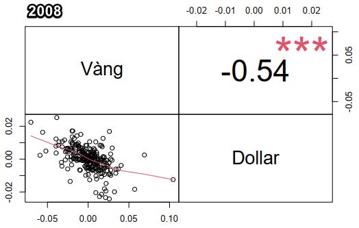 Tôi có khả năng là đã bỏ lỡ quan sát đối với từng chu kỳ như 3 tháng, hay nửa năm khi mà giá vàng và chỉ số Dollar Index có thể chuyển động cùng nhau, hay có những đột biến nào đó.