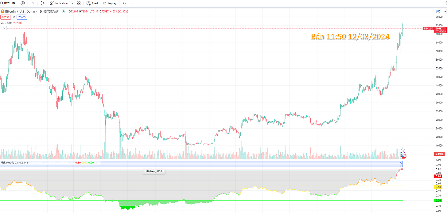Hiện tại chỉ báo cho thấy giá Bitcoin đã rơi vào vùng rủi ro cao (màu đỏ). Là một trong những điều kiện làm tôi ra quyết định nghỉ chơi.