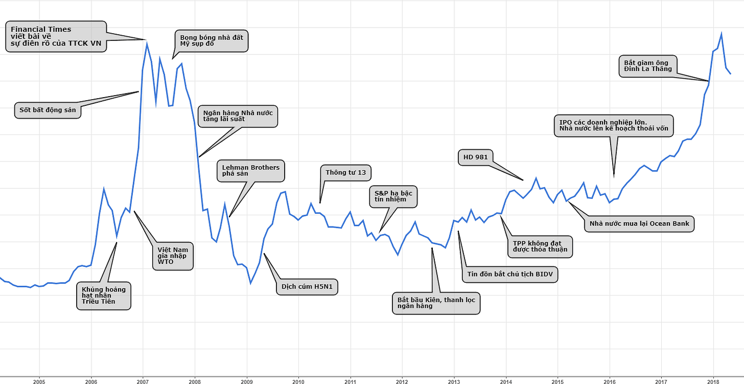 Đây là biểu đồ VNINDEX từ 2005 đến 2018. Nếu muốn bán thì lúc nào bạn cũng có lý do để bán cả.