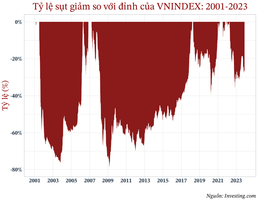 Từ năm 2001 đến 2023, VNINDEX đã chứng kiến nhiều đượt sụt giảm mạnh thông qua biểu đồ "Tỷ lệ sụt giảm" dưới đây (hay còn gọi là Drawdowns).