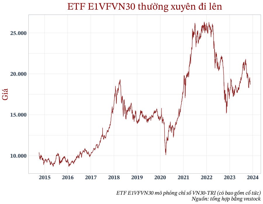 Trong phần này, tôi sử dụng dữ liệu của ETF E1VFVN30. ETF này mô phỏng chỉ số VN30-TRI (có bao gồm cổ tức). Sử dụng để phản ánh tổng tăng trưởng của chỉ số hợp lý hơn việc sử dụng VNINDEX hoặc VN30.