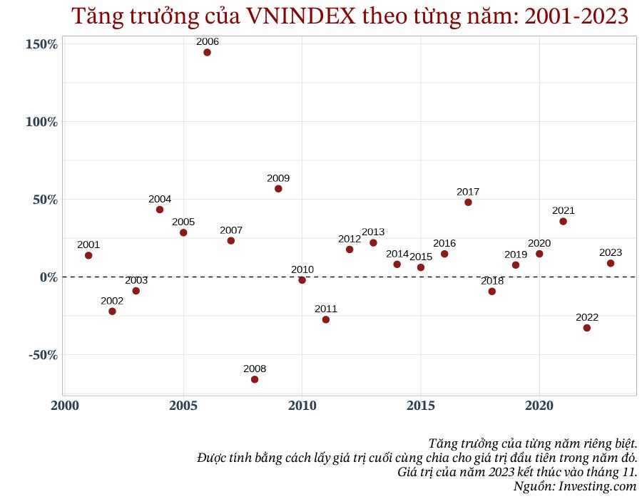 Tuy nhiên, có một điểm sáng ở đây: từ năm 2001 đến 2023, chỉ có 7 năm là ghi nhận tăng trưởng âm (trên tổng số 23 năm, tương ứng tỷ lệ 30%). Hay có thể nói thị trường chứng khoán thường xuyên đi lên.