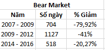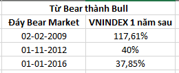 Tôi đã xem lại VNINDEX, và thử tính thời gian Bear Market, và % VNINDEX tăng 1 năm bắt đầu từ đáy Bear Maket.