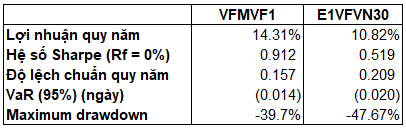 Tôi thấy quỹ VFMVF1 này rủi ro thấp hơn ETF VN30, nhưng mang lại tỷ suất sinh lợi cao hơn. Trong ngắn hạn không phản ánh được gì về độ hiệu quả nhưng nếu xem xét quãng thời gian dài thì VFMVF1 bỏ xa ETF VN30.