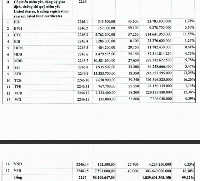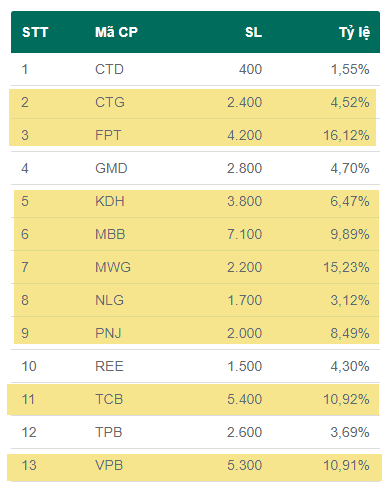 Trong khi đó FINLEAD thì tập trung chủ yếu vào cổ phiếu ngân hàng, chứng khoán: