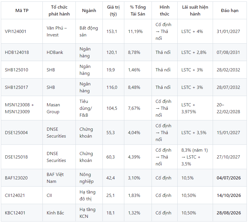 Đây là trụ cột thu nhập dài hạn của danh mục. Nhóm này gồm ba trái phiếu ngân hàng với lãi suất thả nổi dài hạn: