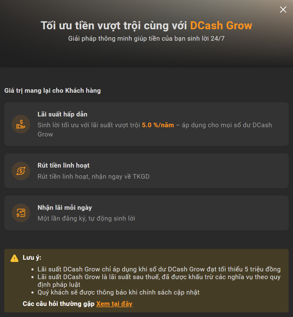 Sản phẩm Dcash Grow đang có mức lãi suất 5%/năm (sau thuế) cho các nhà đầu tư có tài khoản trên VNDirect. Chỉ cần tối thiểu 5 triệu là hệ thống sẽ bắt đầu tính lãi cho người chơi.