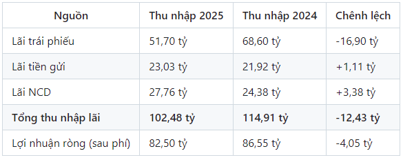 Tại mức LSTC 5% cuối năm 2025, doanh nghiệp đang trả 9%/năm. Đây là nguồn lãi lớn nhất trong danh mục trái phiếu.