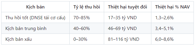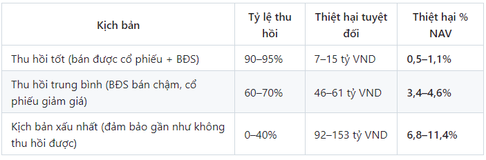 Kịch bản xấu chỉ xảy ra trong lý thuyết. Thực tế là cho dù VPI vỡ nợ, Dragon Capital vẫn có khả năng thu hồi một phần qua thương lượng, tái cơ cấu hoặc phát mãi tài sản. Mức thiệt hại thực tế thấp hơn nhiều, khả năng rơi vào 4,6% NAV.