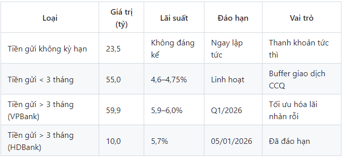 Tháng 01-03/2026: 10 tỷ tiền gửi HDBank + 60 tỷ tiền gửi VPBank + 50 tỷ chứng chỉ tiền gửi VPBank đáo hạn → Dragon Capital sẽ tái đầu tư ở lãi suất mới