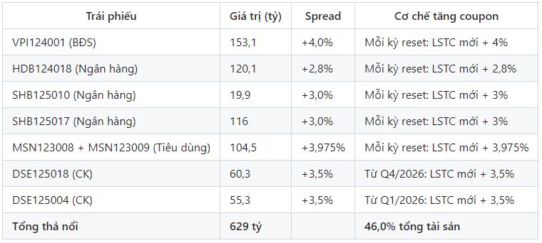 Năm đầu lãi cố định, sau đó chuyển sang LSTC + 3,975%. Coupon cao thứ hai trong danh mục, chỉ sau VPI (+4%). Tại LSTC = 5%, hai trái phiếu này đang trả coupon 8,975%/năm.