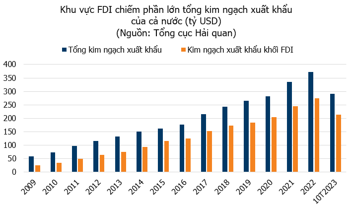 Trong năm 2023, tổng kim ngạch xuất khẩu hàng hóa nước ta nước ta ước tính là 355,5 tỷ USD. Khối doanh nghiệp FDI đóng góp 73,1%.