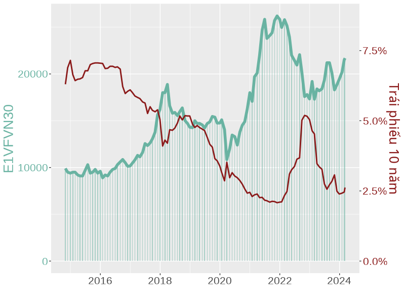 Để dễ dàng hình dung hơn bạn có thể tham khảo biểu đồ về biến động của ETF E1VFVN30 và lợi tức trái phiếu chính phủ kì hạn 10 năm từ năm 2014 đến nay.