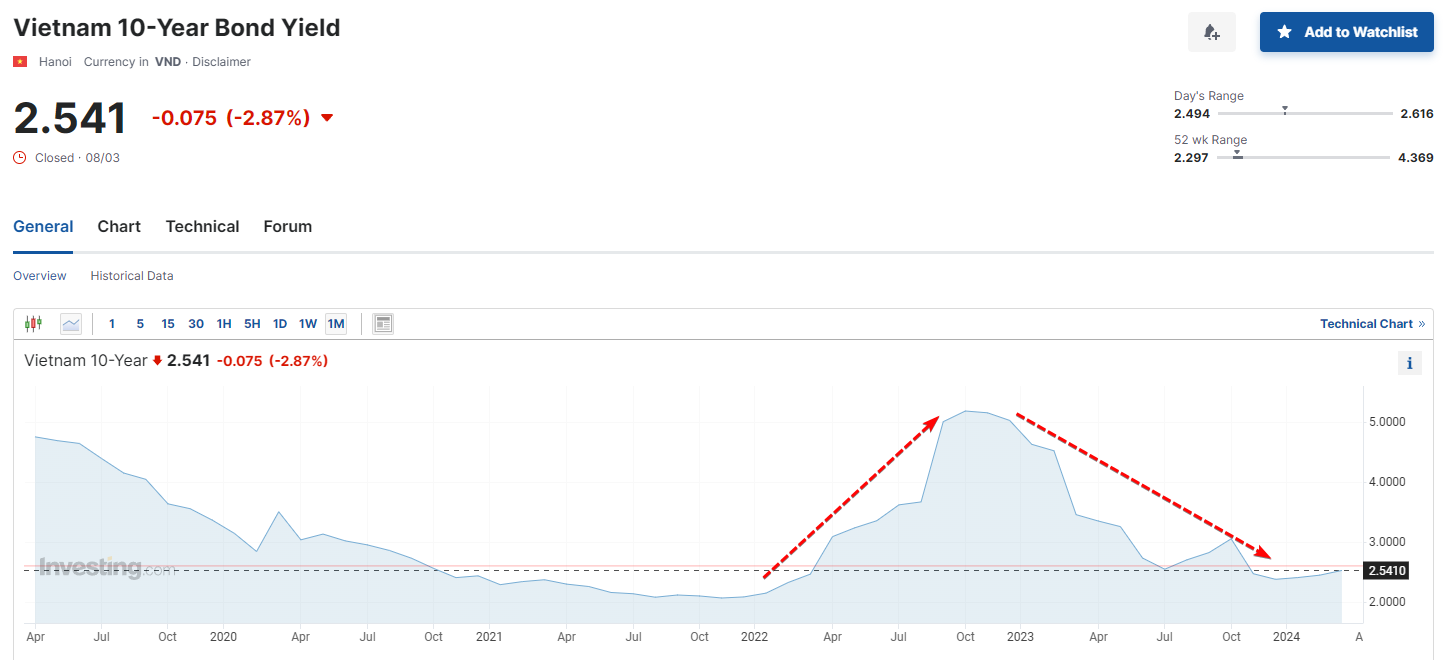 Cách dễ nhất mà tôi hay sử dụng để theo dõi chính là quan sát lợi tức trái phiếu chính phủ kỳ hạn 10 năm tại Investing.com(bond yield) hoặc TradingView(VN10Y)