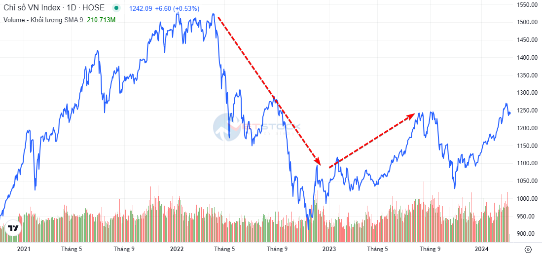 Cho đến đầu năm 2023 thì chỉ số có xu hướng giảm. Đến tháng 08 và 09/2023 thì chỉ số tăng trở lại. Và từ tháng 10 trở đi thì chỉ số có xu hướng giảm tới cuối năm.