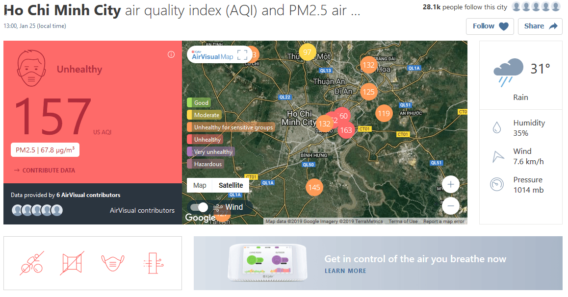 Mấy tháng gần đây, cứ mỗi khi ra ngoài đường là cổ họng tôi khô, cảm giác muốn ho liên tục, còn ở nhà thì không sao (Tôi ở nhà hầu như mọi ngày, một tuần ra đường cao lắm là hai lần). Tôi lên mạng tìm hiểu và vô tình "đáp" trúng trang web theo dõi ô nhiễm không khí https://www.airvisual.com/vietnam/ho-chi-minh-city .