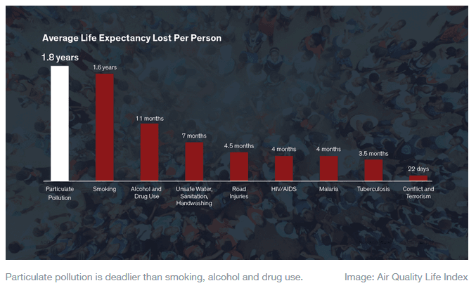 Ô nhiễm không khí rút ngắn tuổi thọ con người đi 1.8 năm, hơn cả việc hút thuốc hay là HIV/AIDS. Ở Ấn Độ, tuổi thọ trung bình bị rút ngắn đi 11 năm, Trung Quốc là ~7 năm chính là bởi vì ô nhiễm không khí.