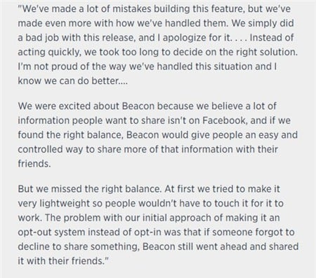 Có lẽ bạn chưa biết, đây không phải là vụ lộ thông tin cá nhân đầu tiên của Facebook. Trong năm 2007, Facebook đã làm lộ thông tin người dùng bằng cách để một ứng dụng bên thứ 3 Beacon đăng tải các thông tin cá nhân của người mua sản phẩm khi chưa được đồng ý. Sau đó, chính họ cũng đứng ra xin lỗi một lần.