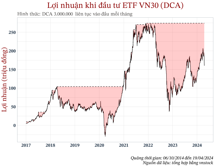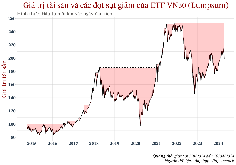 Trong trường hợp của ETF VN30, gần 95% các ngày giao dịch là nằm trong các đợt sụt giảm từ đỉnh.