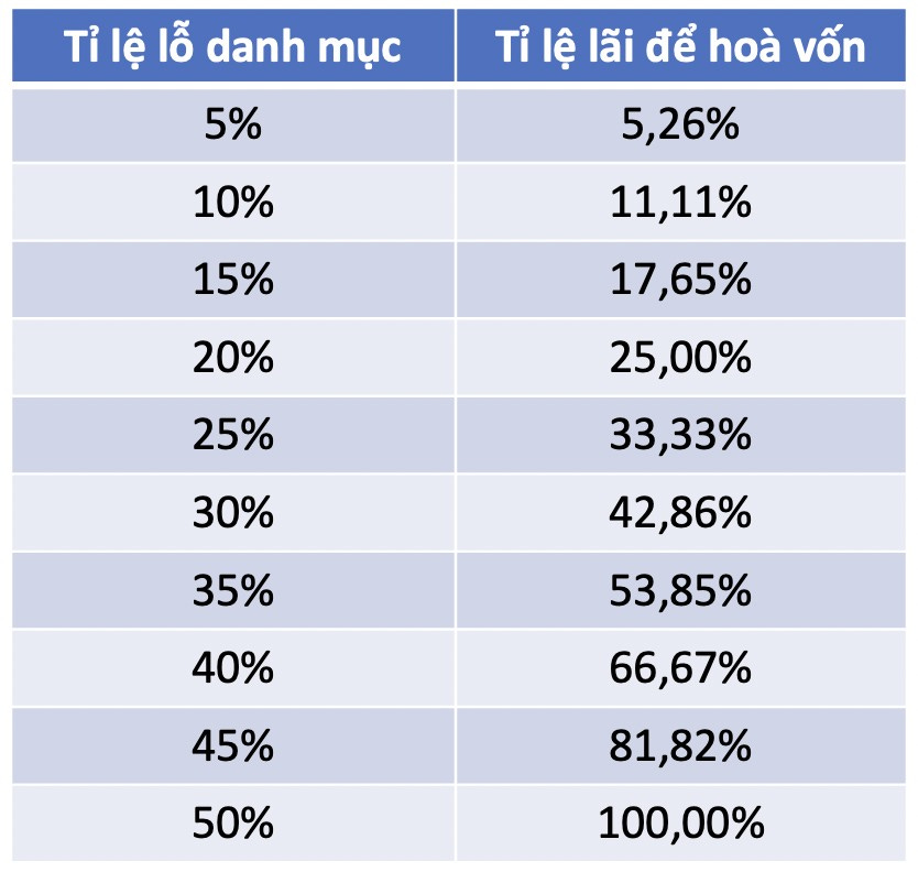 Mực độ sụt giảm càng lớn thì nhà đầu tư càng gánh chịu hậu quả nặng nề, càng mất nhiều thời gian để danh mục tăng trưởng trở lại cho nên cần phải lên kế hoạch đầu tư hợp lý hơn.
